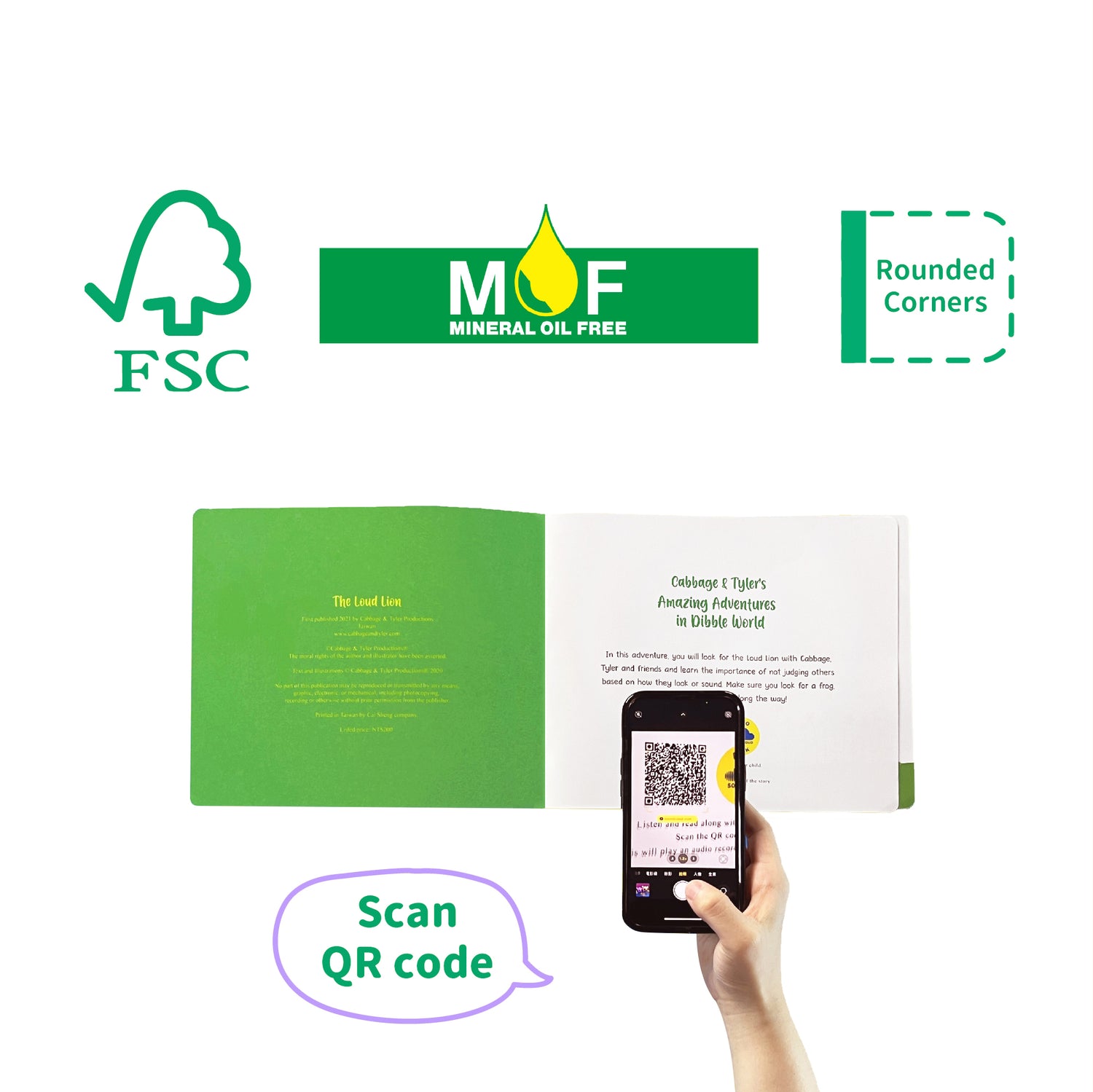我們的故事書相當適合孩子們使用,採用了 MOF 油墨確保安全、圓角和防水頁面。每本書均採用 FSC 認證紙張製成,體現我們對孩子們的安全性和環境保護的承諾。讓您的小寶貝們沉浸在無憂的閱讀冒險中!